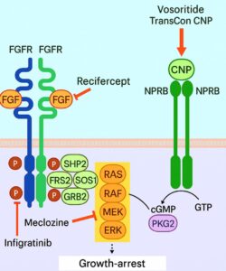 Figure 1. Treatment Strategies for Achondroplasia. Activation of FGFR3 begins when FGF ligands bind to and induce dimerisation of the receptor, triggering transphosphorylation (P) of its intracellular kinase domain. This leads to recruitment of adaptor proteins (FRS2, SHP2, and GRB2), which in turn enable SOS1 to activate RAS and initiate the downstream RAS–ERK signalling cascade, which causes growth arrest in achondroplasia. Current therapeutic approaches under clinical evaluation for achondroplasia are designed to reduce FGFR3 signalling through multiple mechanisms. These include: Recifercept, which acts as a decoy receptor to neutralize FGF ligands; Infigratinib, which inhibits the kinase activity of FGFR3; Meclozine, which directly suppresses the RAS–ERK signalling pathway. In contrast, TransCon CNP and Vosoritide operate via the CNP signalling pathway, counteracting FGFR3 signalling by promoting PKG2-dependent inhibitory phosphorylation of RAF, thereby attenuating downstream effects of the FGFR3 pathway. Figure generated with the assistance of artificial intelligence (ChatGPT).